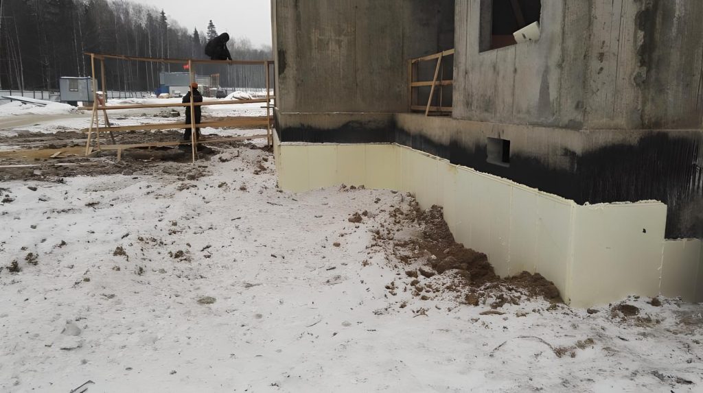 После «созревания» мембраны возможно немедленное продолжение работ, установка утеплителя, защита гидроизолирующего покрытия мембраной Плантер и производство обратной отсыпки грунта.